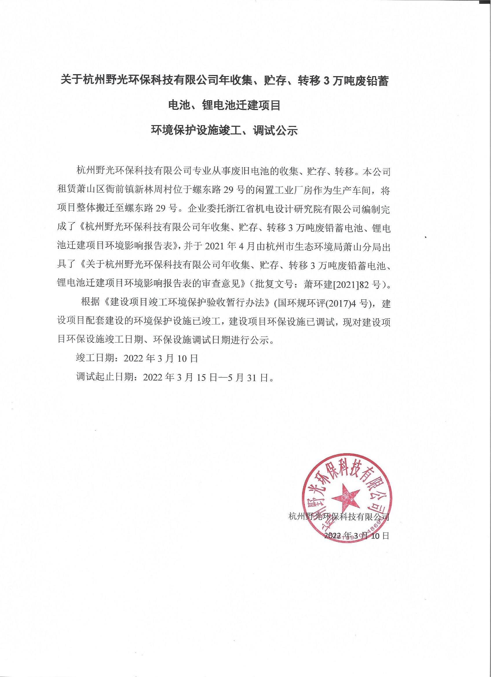 杭州野光環(huán)??萍加邢薰灸晔占?、貯存、轉(zhuǎn)移3萬(wàn)噸廢鉛蓄電池、鋰電池遷建項(xiàng)目環(huán)保設(shè)施竣工、調(diào)試公示