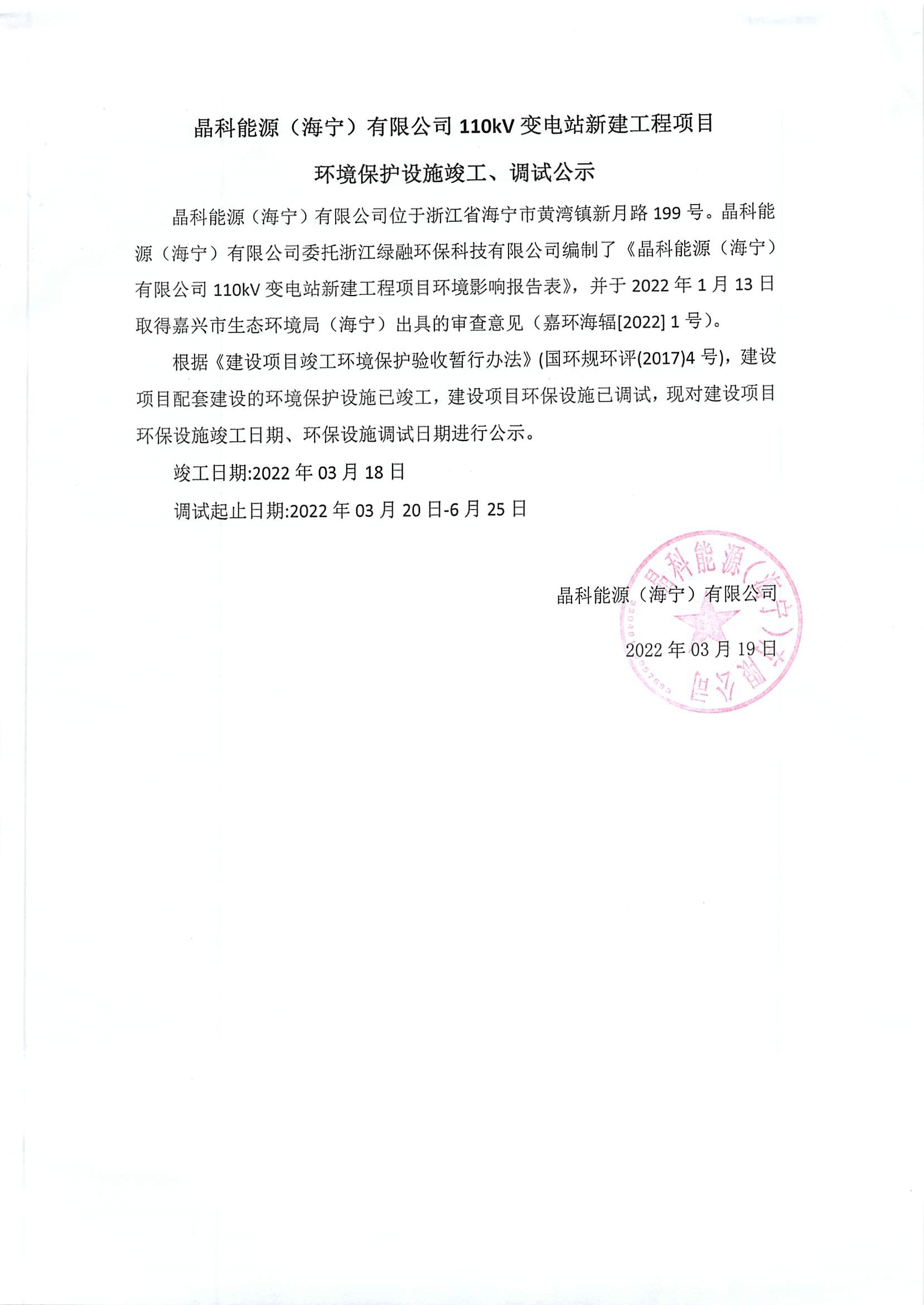 項目名稱:晶科能源(海寧)有限公司110kV 變電站新建工程項目