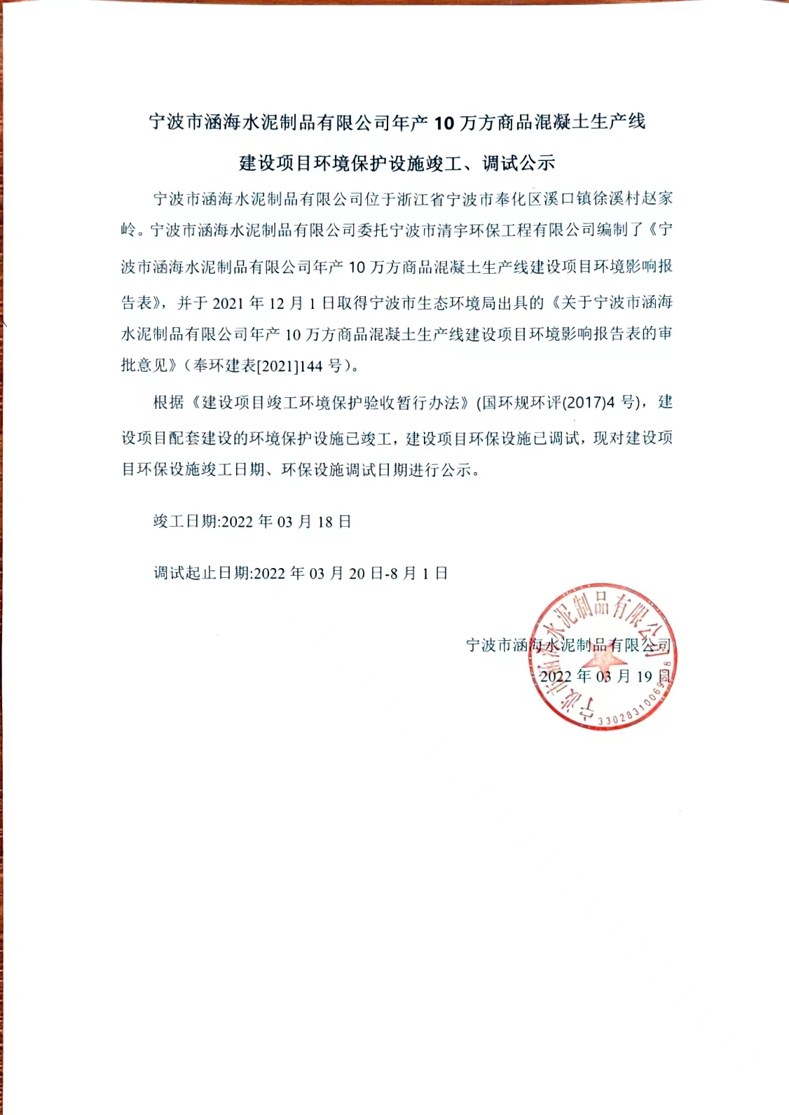 寧波市涵海水泥制品有限公司年產(chǎn)10萬方商品混凝土生產(chǎn)線建設(shè)項(xiàng)目環(huán)保設(shè)施竣工、調(diào)試公示