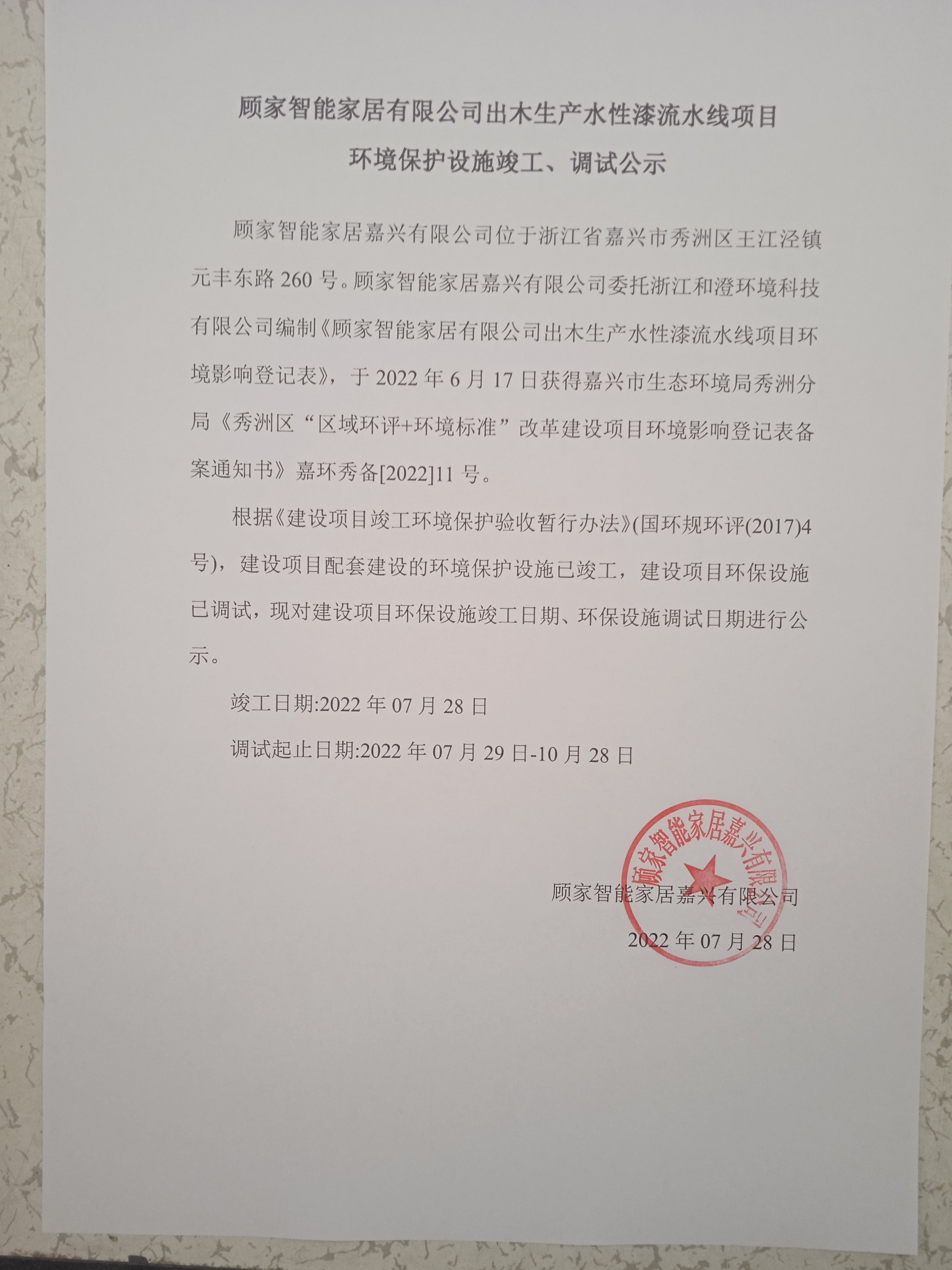 顧家智能家居有限公司出木生產(chǎn)水性漆流水線項目環(huán)保設(shè)施竣工、調(diào)試公示