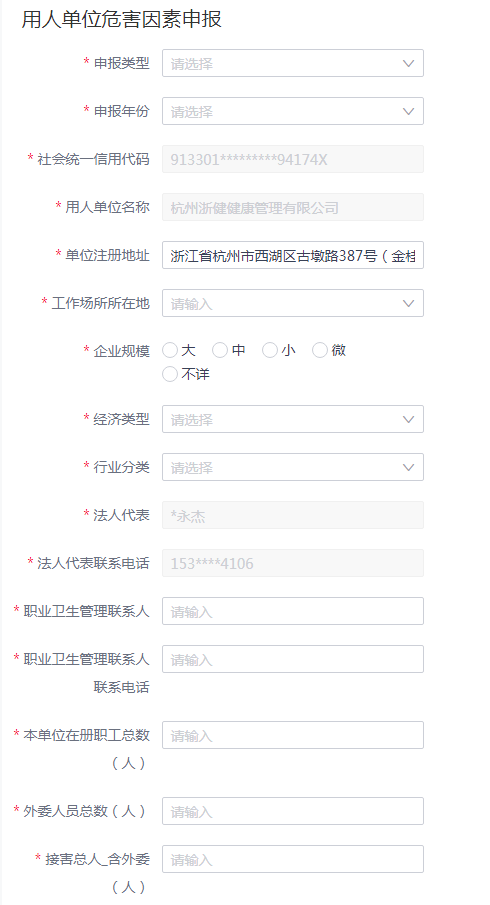 9. 根據(jù)提示內(nèi)容填寫信息,包括社會統(tǒng)一信用代碼、用人單位名稱、注冊地址、規(guī)模以及經(jīng)濟類型、行業(yè)分類、法人代表、聯(lián)系電話、各類人數(shù)等一系列單位基本信息,以及申報類型和年份,帶有*的必填