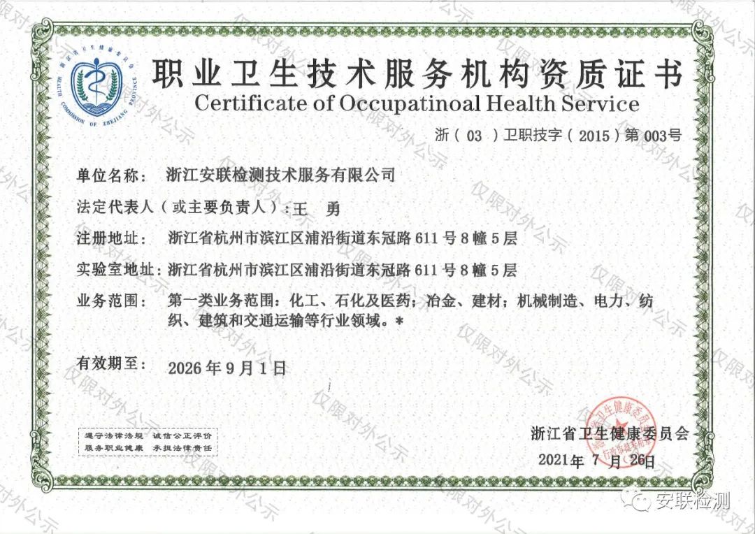 杭州市衛(wèi)生健康委員會(huì)在接受我司資質(zhì)認(rèn)可申請(qǐng)后,于2021年7月22日至7月23日組織技術(shù)專家組對(duì)我司進(jìn)行了現(xiàn)場(chǎng)評(píng)審,專家組通過現(xiàn)場(chǎng)勘查、技術(shù)人員考核、查閱資料等方式,最終認(rèn)定我司持續(xù)具備在業(yè)務(wù)范圍內(nèi)開展職業(yè)衛(wèi)生技術(shù)服務(wù)的能力,通過現(xiàn)場(chǎng)評(píng)審,并于2021年7月26日順利取得新的“職業(yè)衛(wèi)生技術(shù)服務(wù)機(jī)構(gòu)資質(zhì)證書”。