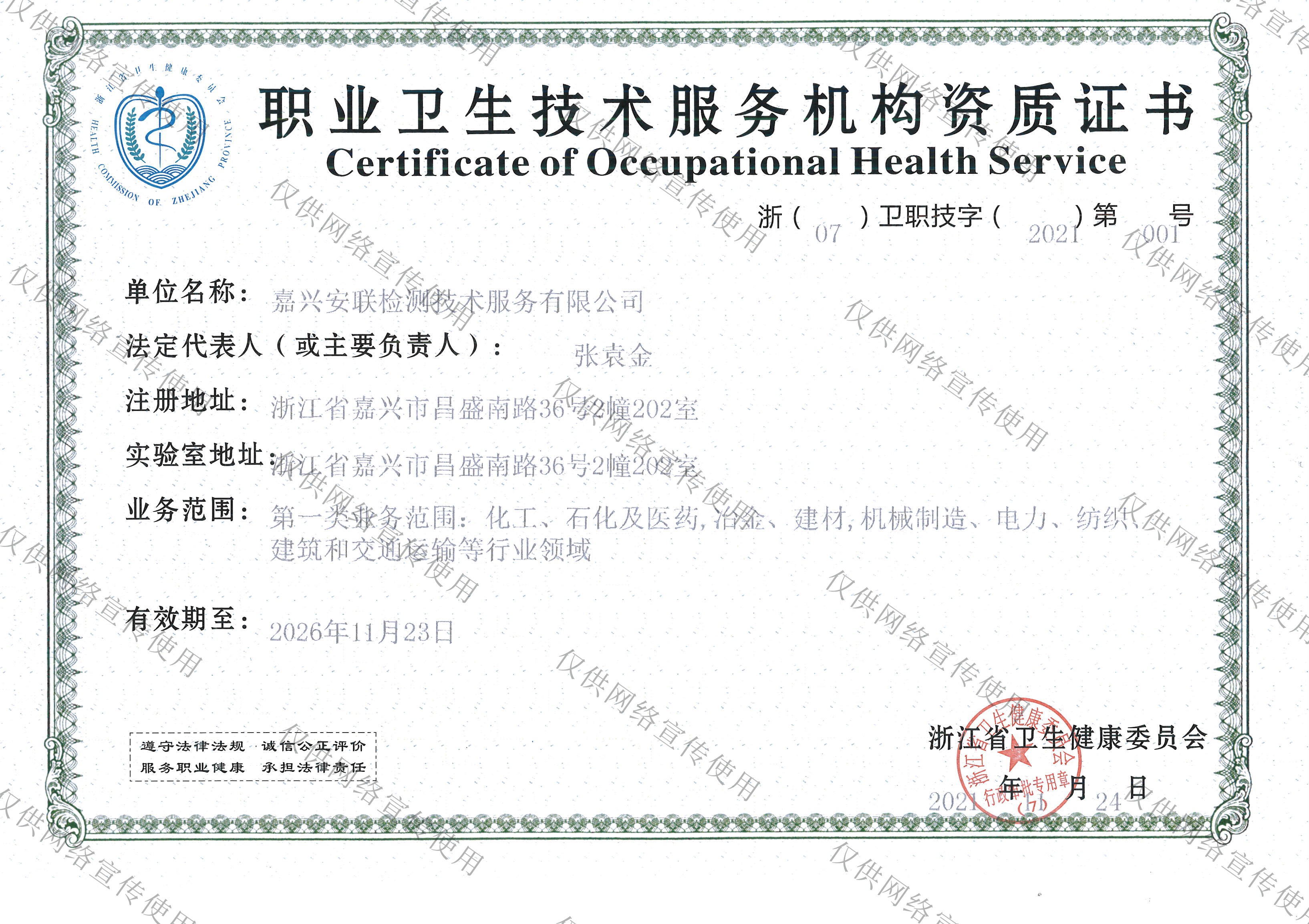 喜訊:嘉興安聯(lián)順利取得《職業(yè)衛(wèi)生技術(shù)服務(wù)機(jī)構(gòu)資質(zhì)證書》!